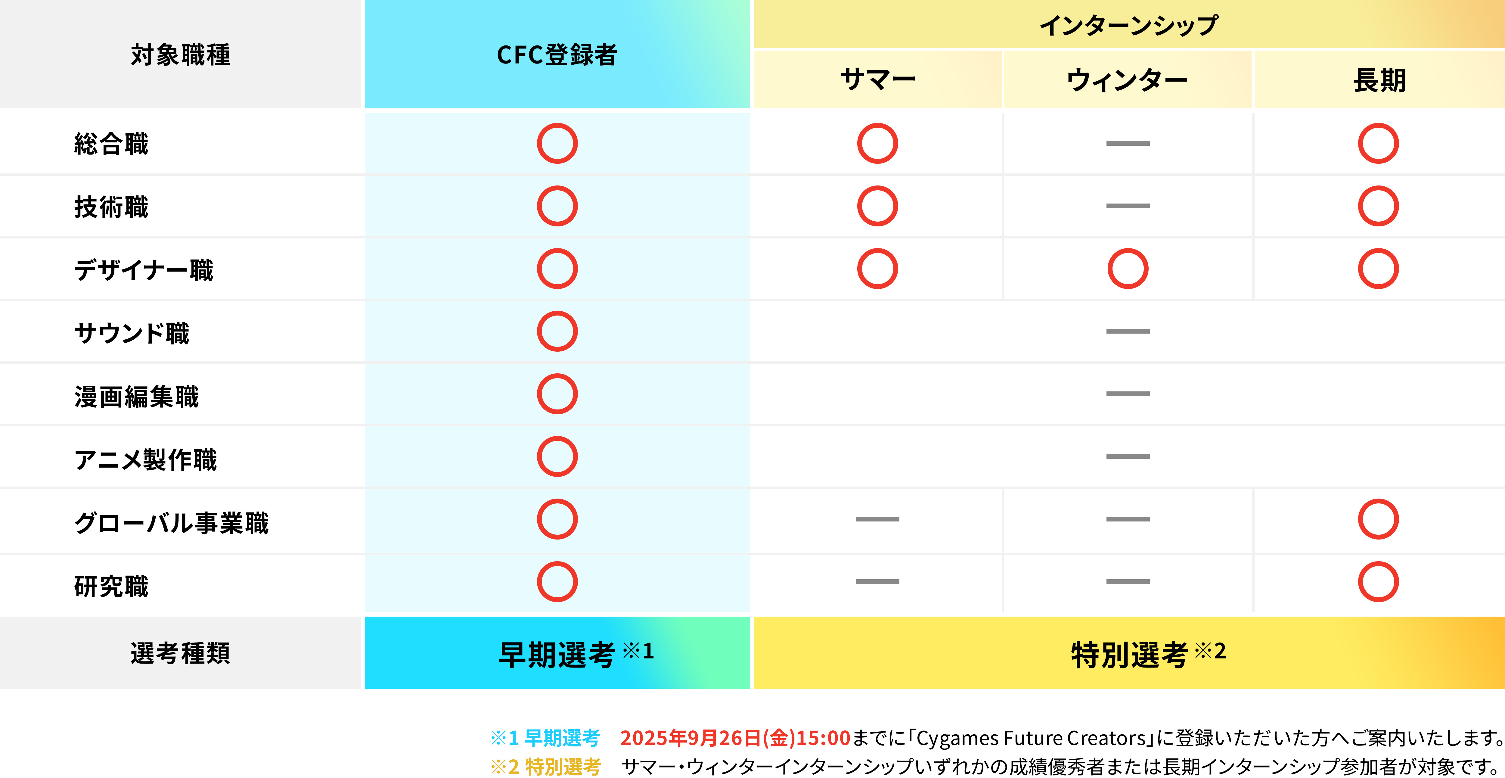 インターンシップ・早期選考・特別選考を希望される方は「Cygames Future Creators」への登録が必須です。