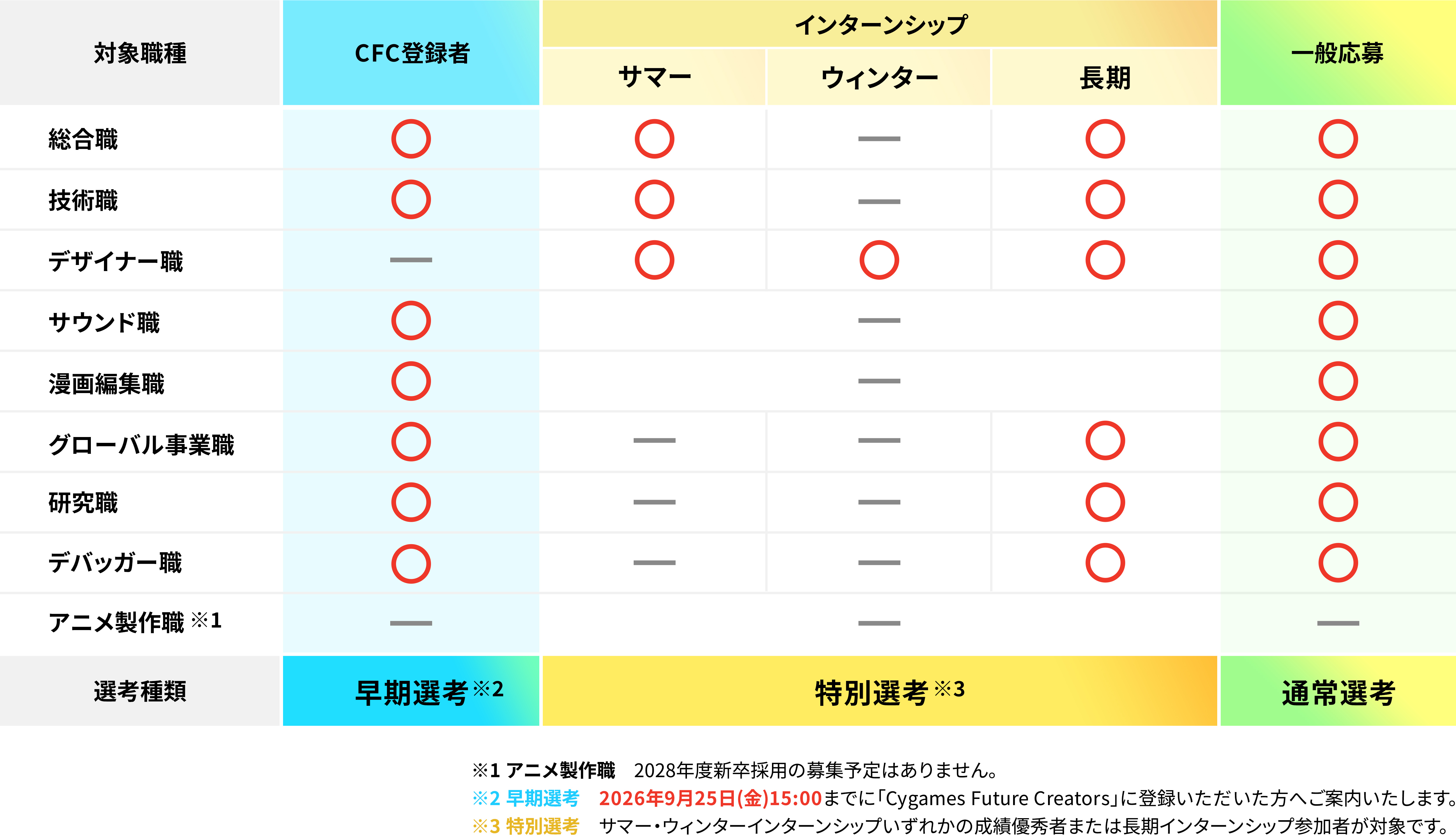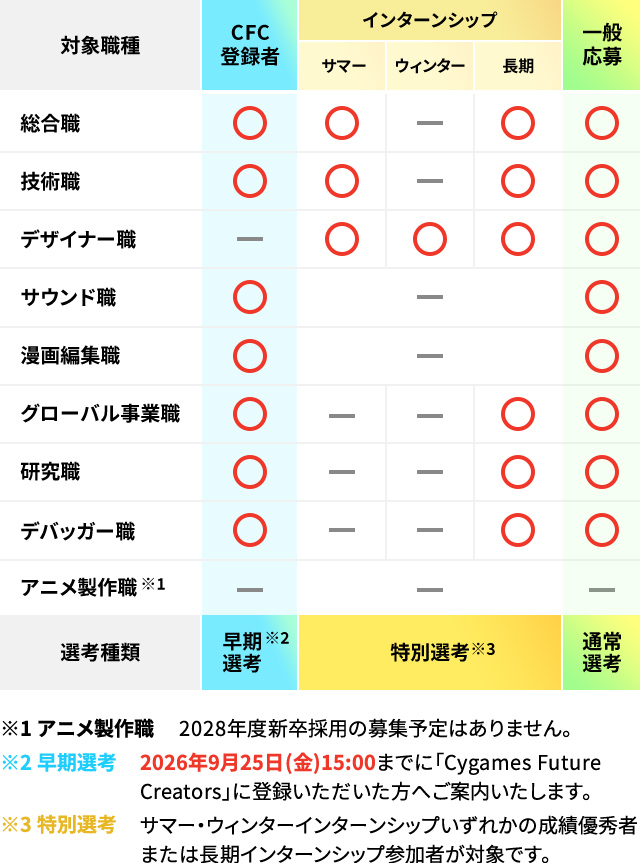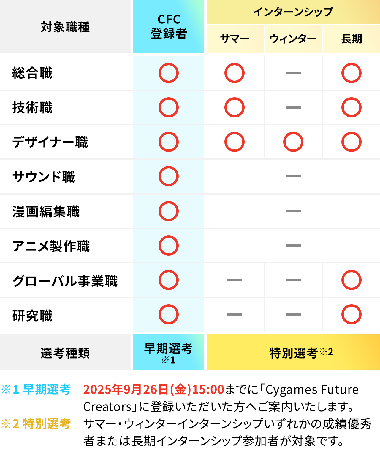 インターンシップ・早期選考・特別選考を希望される方は「Cygames Future Creators」への登録が必須です。